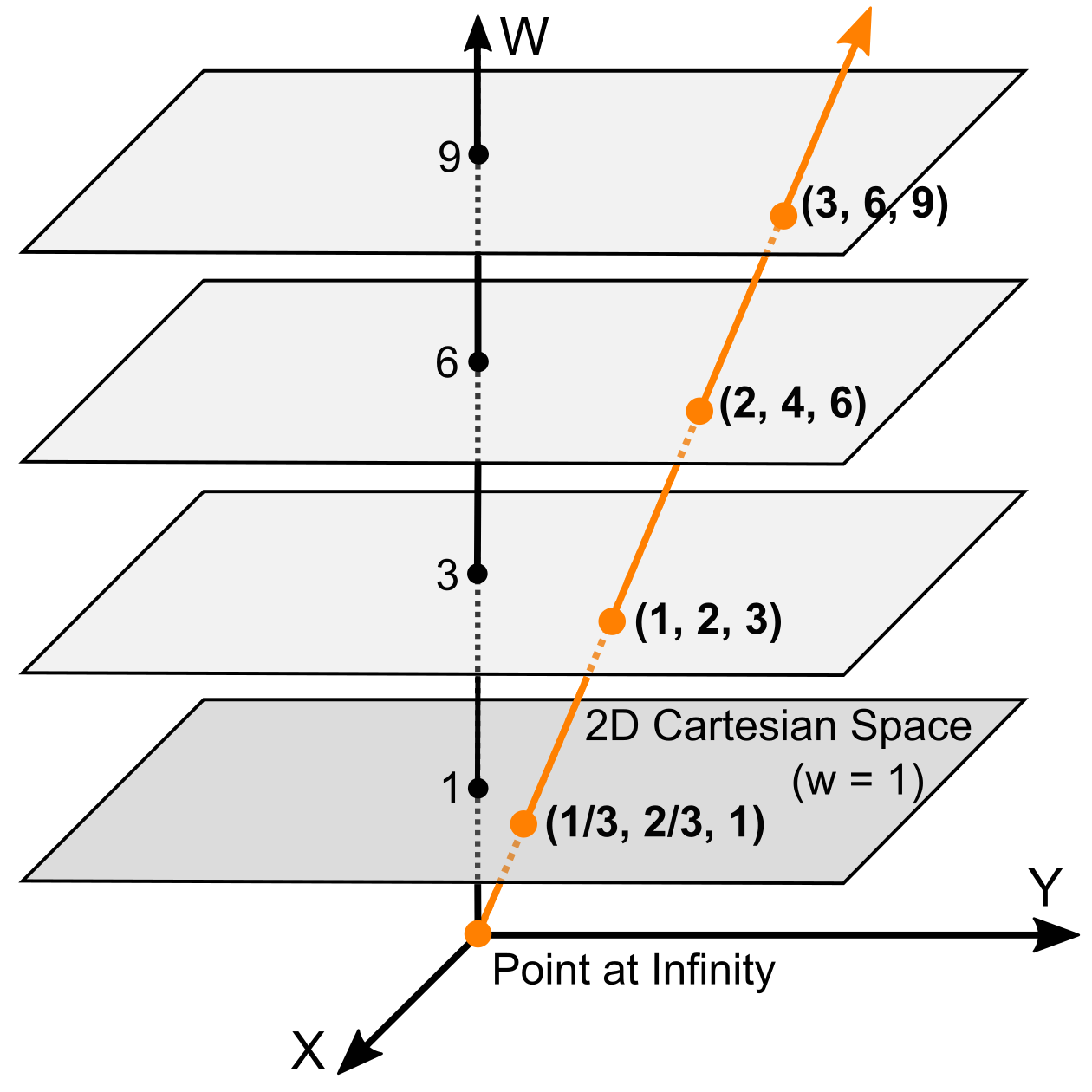 동차좌표계에서는 2차원의 점 (x,y)를 3차원 벡터 (x,y,w)로 표현한다. 실제 좌표는 w로 나눈 (x/w, y/w)가 된다. 따라서 하나의 2차원 점을 표현하는 방법이 무한히 많아진다. 예를 들어, (2,3,1), (4,6,2), (6,9,3)은 모두 2차원 평면상의 같은 점 (2,3)을 나타낸다.