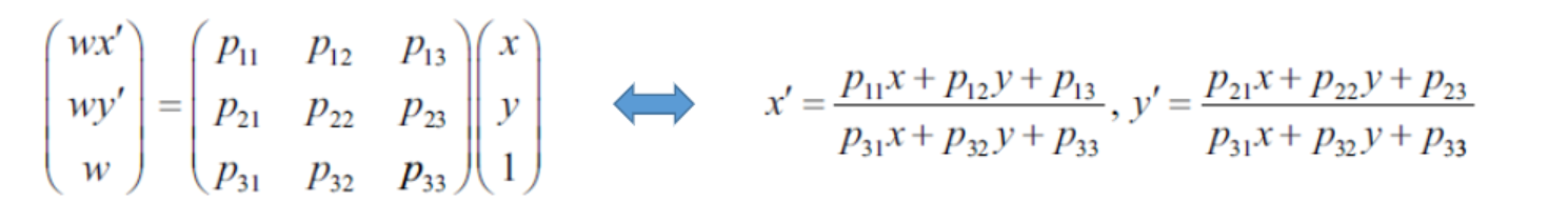 2D 이미지 변환의 경우 3x3 크기의 homography matrix가 필요하다. 이는 2차원 평면상의 점을 동차좌표로 표현할 때 3차원 벡터 (x,y,w)를 사용하기 때문이다. 따라서 한 점에서 다른 점으로의 변환을 표현하기 위해서는 3x3 행렬이 필요하다.