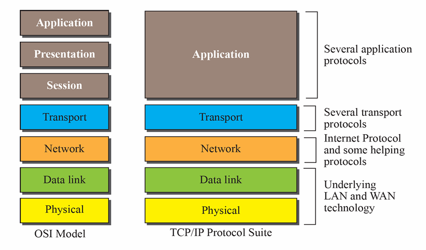 하위 계층에서 전송 계층(4계층)은 원격 응용 프로세스 간의 데이터 세그먼트의 신뢰성 있는 전송을 담당하며, 세그멘테이션, 확인응답, 다중화를 포함한다. 네트워크 계층(3계층)은 다중 노드 네트워크의 구조화 및 관리를 담당하며, 주소 지정, 라우팅, 트래픽 제어를 처리한다. 데이터 링크 계층(2계층)은 물리 계층으로 연결된 두 인접 노드 간의 데이터 프레임의 신뢰성 있는 전송을 담당한다. 물리 계층(1계층)은 물리적 매체를 통한 원시 비트 스트림의 전송 및 수신을 담당한다.