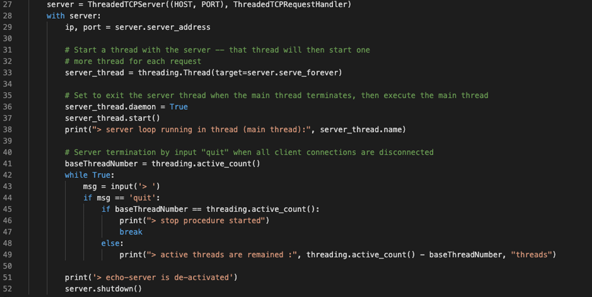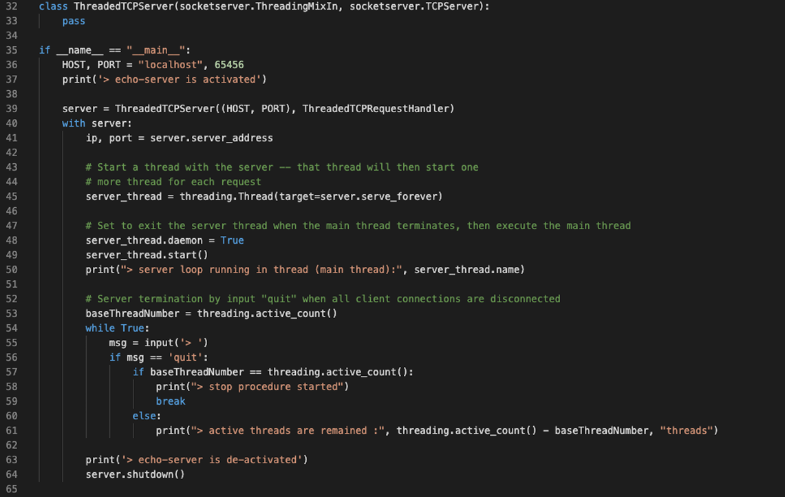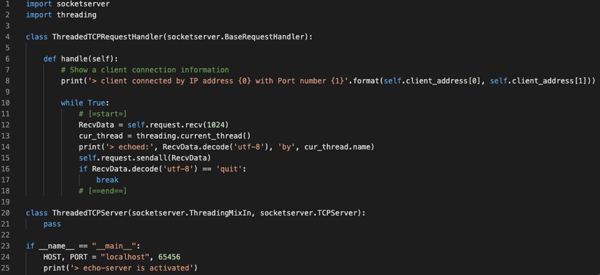 handle() 메서드 내부에서는 기본 에코 서버의 기능을 구현하고 있다. 클라이언트로부터 데이터를 수신하고(self.request.recv), 동일한 데이터를 다시 클라이언트에게 전송한다(self.request.sendall). 클라이언트가 'quit' 메시지를 보내면 처리를 종료한다.