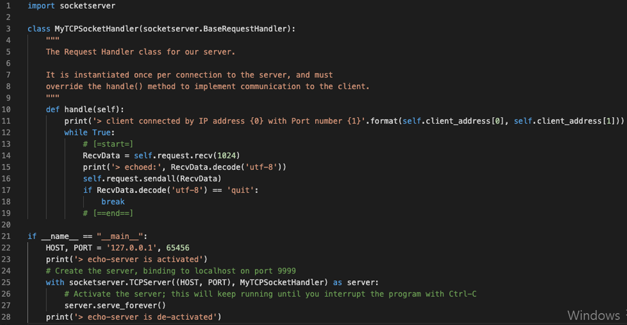 위 코드는 다음과 같은 단계로 socketserver.TCPServer를 사용하여 에코 서버를 구현하고 있다: