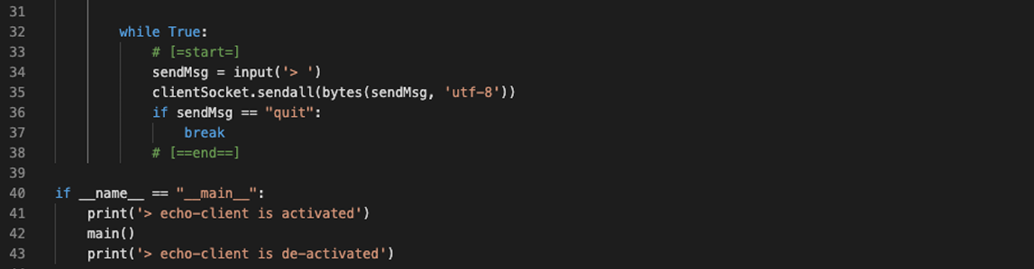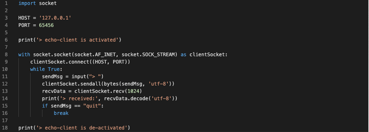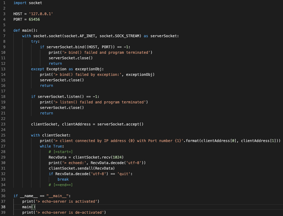 - 무한 루프에서 클라이언트로부터 데이터를 수신(recv)하고, 동일한 데이터를 다시 클라이언트에게 전송(sendall)하는 에코 기능을 수행한다.