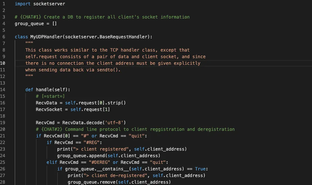 - 클라이언트 정보 관리: 서버는 모든 클라이언트의 소켓 정보를 저장하기 위한 데이터베이스(group_queue)를 생성하여 관리한다. 이는 코드의 {CHAT#1} 부분에서 확인할 수 있다.