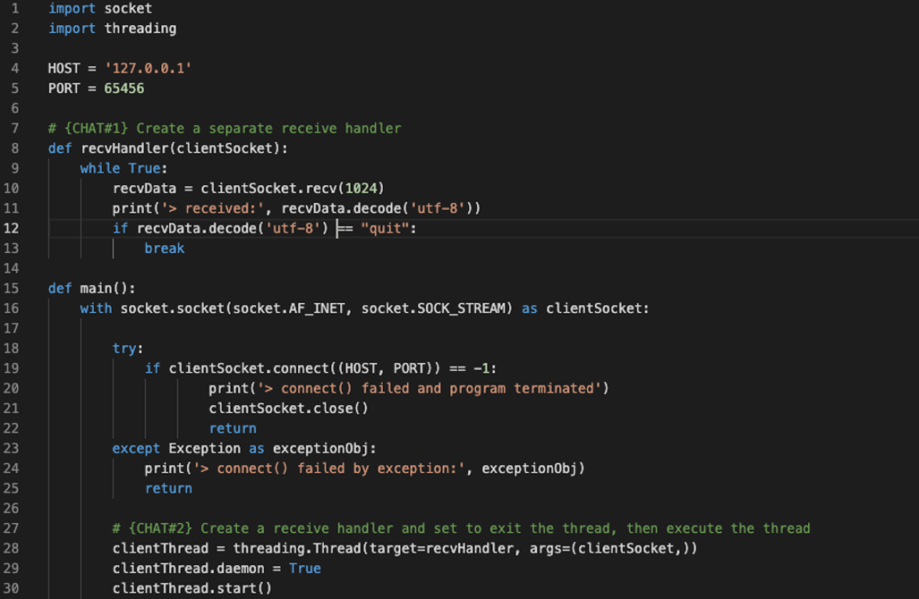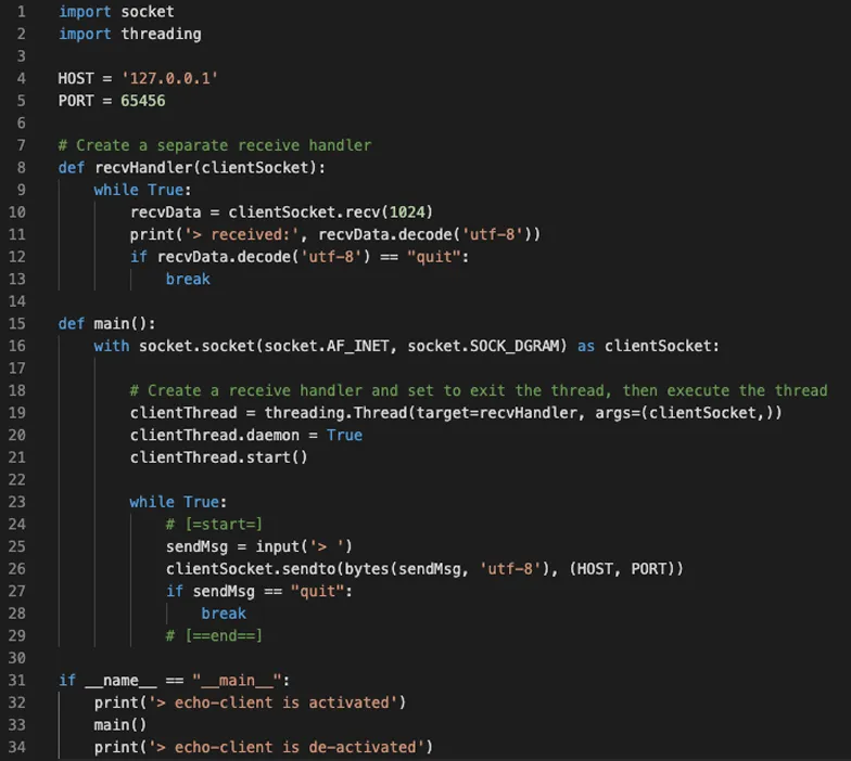 - clientThread.daemon = True 설정으로 메인 스레드 종료 시 수신 스레드도 함께 종료되도록 한다.