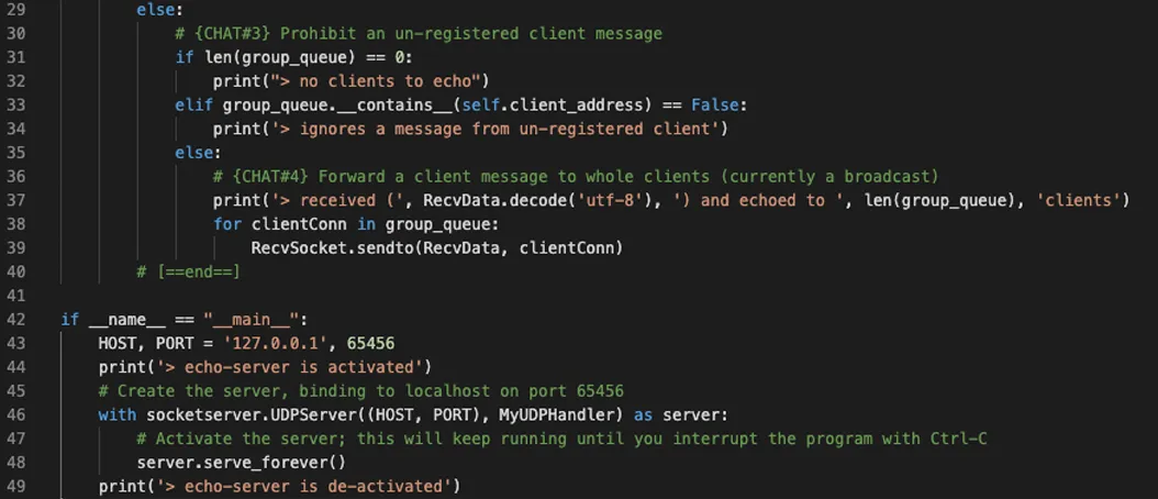 - 미등록 클라이언트 메시지 차단: 등록되지 않은 클라이언트로부터의 메시지는 처리되지 않는다. 서버는 group_queue에 있는 클라이언트 주소만 처리하고, 그렇지 않은 경우 무시한다. 이는 {CHAT#3} 부분에서 확인할 수 있다.