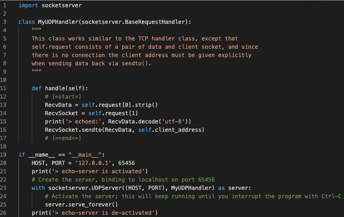 - socketserver.UDPServer 클래스를 사용하여 UDP 서버를 구현한다.