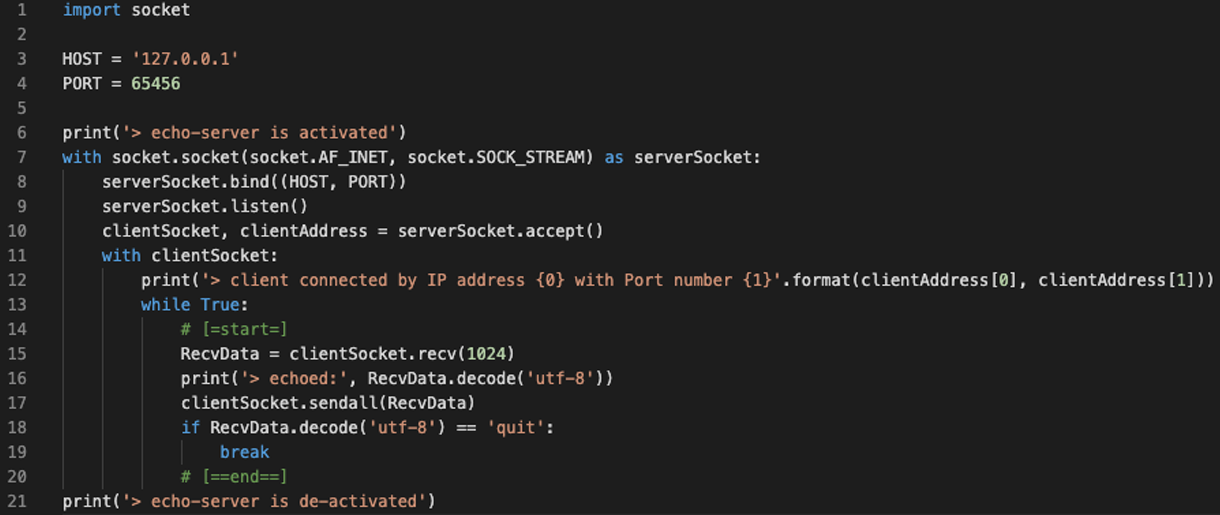 Python으로 구현된 TCP 에코 서버 코드는 다음과 같은 과정을 수행한다: