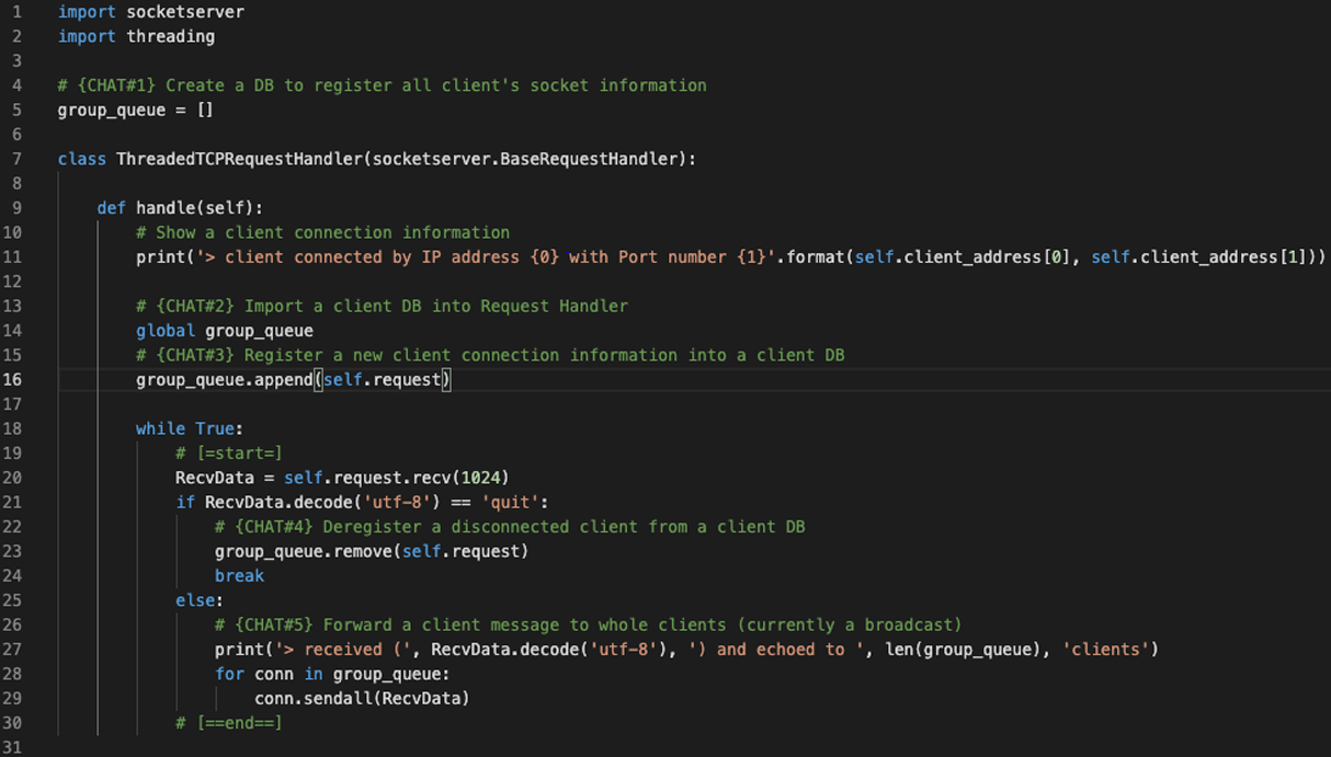 - 클라이언트 정보 관리: 서버는 모든 클라이언트의 소켓 정보를 저장하기 위한 데이터베이스(group_queue)를 생성하여 관리한다. 이는 코드의 {CHAT#1} 부분에서 확인할 수 있다.
