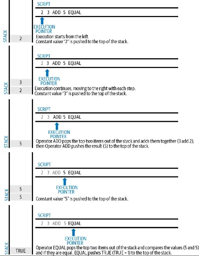 위 그림은 Bitcoin Script의 실행 예시를 보여준다. 이는 스택 기반 언어로, 각 명령어가 스택에 있는 값을 조작한다: