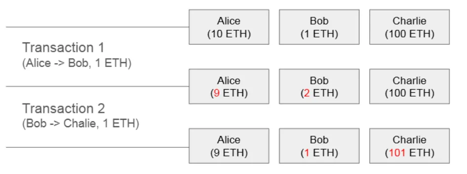 - Transaction 2에서 Bob은 Charlie에게 1 ETH를 보내고, Bob의 잔액은 2 ETH에서 1 ETH로 감소하고 Charlie의 잔액은 100 ETH에서 101 ETH로 증가한다.