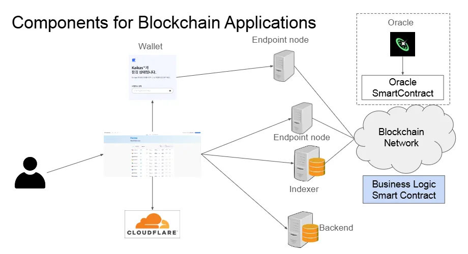 Web2 애플리케이션은 주로 프론트엔드와 백엔드라는 두 가지 주요 구성 요소로 이루어져 있다. 프론트엔드는 사용자 인터페이스를 담당하고, 백엔드는 서버 측 로직과 데이터베이스 관리를 담당한다. 그러나 Web3 환경에서는 이러한 기본 구성 요소 외에도 스마트 컨트랙트, 지갑, 엔드포인트 노드, 인덱서, 오라클과 같은 추가적인 구성 요소가 필요하다.