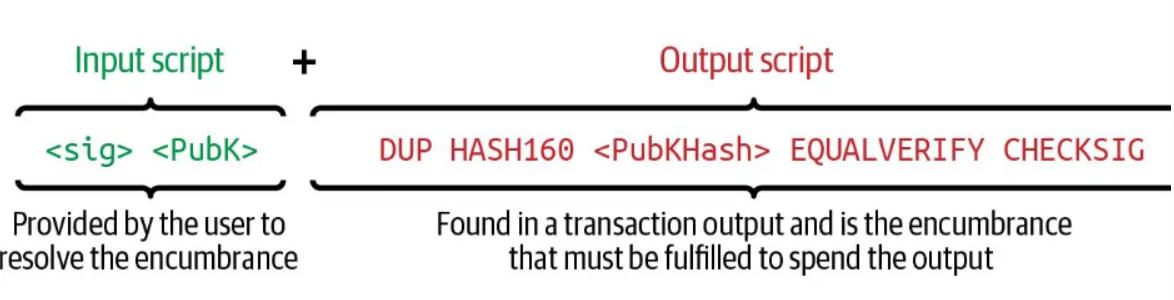 - Input Script: 사용자가 encumbrance(제약 조건)를 해결하기 위해 제공하는 부분. 일반적으로 <sig> <PubK> 형태로, 서명과 공개 키를 포함한다.