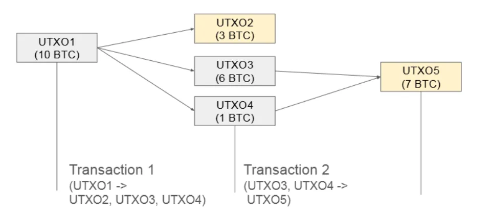 - Transaction 2에서는 UTXO3(6 BTC)와 UTXO4(1 BTC)가 입력으로 사용되어 새로운 출력 UTXO5(7 BTC)를 생성한다.