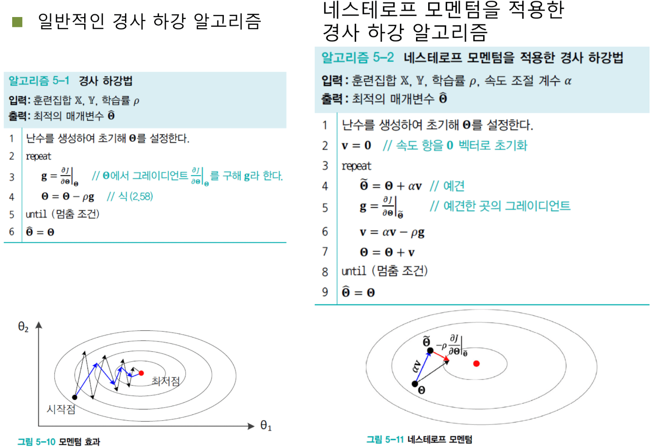 축구에 비유하면 스루패스와 같다. 패스를 받을 선수가 지금 있는 위치가 아니라, 그 선수가 달려갈 미래의 위치를 예견해서 미리 공을 차는 것이다. 네스테로프 모멘텀도 마찬가지다. v로 파라미터를 먼저 업데이트하고, 그 '예견된' 위치에서 그래디언트를 구해서 v와 합친다. 이렇게 하면 궤적이 더욱 부드러워지고 더 좋은 로컬 미니멈에 도달할 확률이 높아진다.