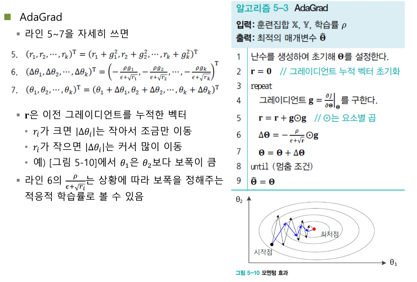 AdaGrad가 이를 구현한 첫 번째 방법이다. r이라는 벡터를 도입하는데, 이것은 그래디언트 제곱의 누적이다. 그래디언트를 구할 때마다 그 제곱을 r에 더한다. 그리고 실제 업데이트할 때는 학습률을 √r로 나눈다. 그래디언트가 컸던 차원은 r이 크니까 학습률이 작아지고, 그래디언트가 작았던 차원은 r이 작으니까 학습률이 커진다. 완벽하다.