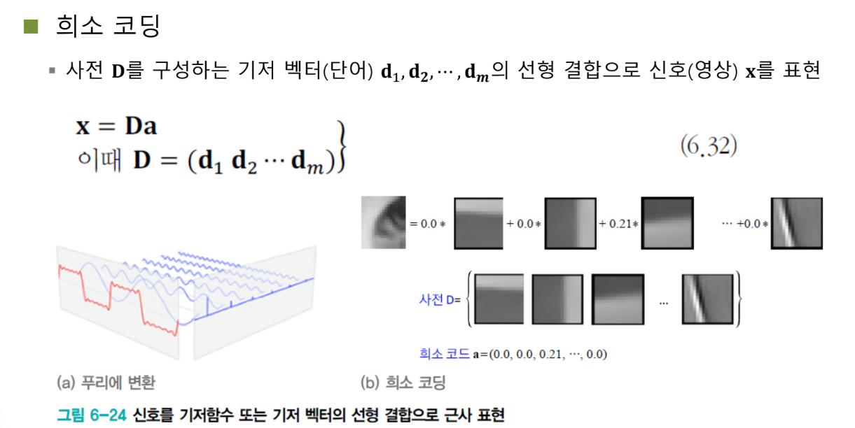 푸리에 변환과 차이: 푸리에는 고정된 삼각함수, 희소 코딩은 학습된 기저 벡터