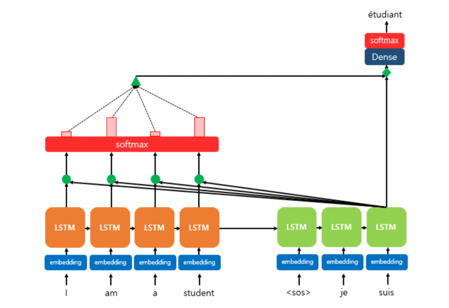 Context vector도 물론 사용되지만, 어쨌든 내가 예를 들어 "suis"라는 단어를 입력으로 넣어서 다음 단어가 뭔지 예측할 때, 인코더에 있는 "I am a student" 각각의 단어를 다 고려해서 출력값을 낸다는 겁니다.