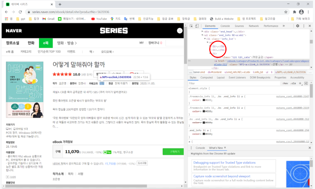 하지만 실질적으로 코드를 작성해 실행시켜보니 출판사와 카테고리가 섞여나오는 문제가 발생했다. 왜 그런가 하고보니 외국서적의 경우 번역가에 대한 li 태그가 추가되어 순서가 변경되었기 때문이었다. 문제해결을 위해 if문을 통해 li 태그가 5개이면 2번째 li 태그를 사용하고 6개이면 3번째 li 태그를 사용하게 했다.