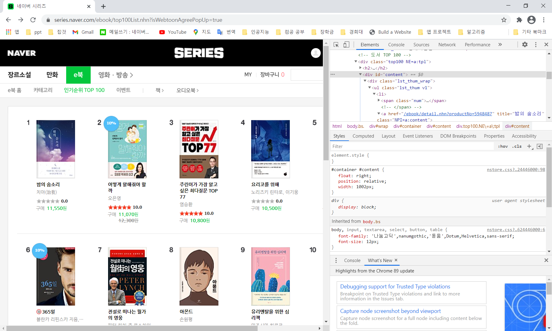 오늘은 파이썬을 사용하여 네이버 e북에서 Top 1~100를 차지하고 있는 책들의 정보를 크롤링한 뒤 카테고리를 카운팅해서 어떤 종류의 책이 인기가 많은지에 대해 살펴보았다.