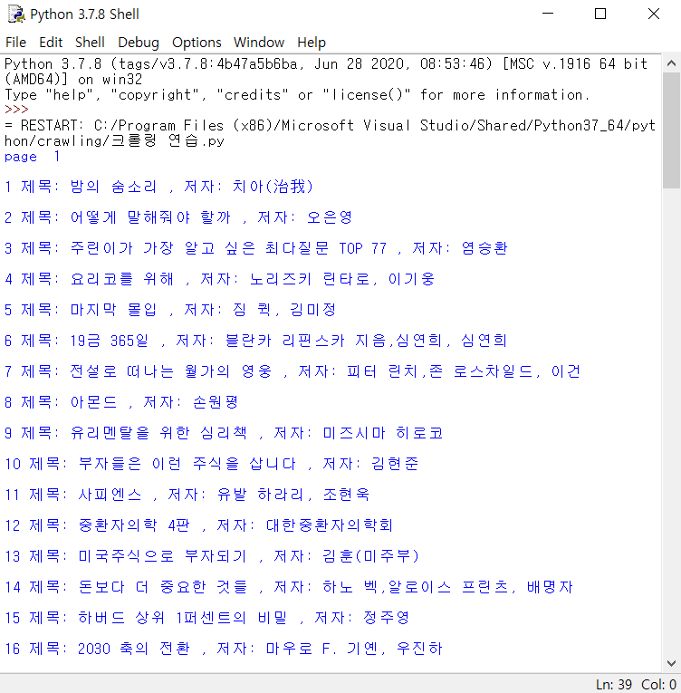 id가 "content"인 div태그를 가진 컨테이너(class가 "lst_thum_wrap"인 div태그를 사용해도 동일한 결과가 나온다)들을 select로 모두 가져오고 각 책의 순위, 제목, 저자 정보를 가져와 아래와 같이 출력시켰다.