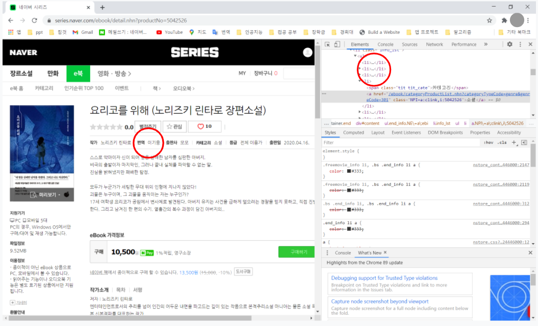 하지만 실질적으로 코드를 작성해 실행시켜보니 출판사와 카테고리가 섞여나오는 문제가 발생했다. 왜 그런가 하고보니 외국서적의 경우 번역가에 대한 li 태그가 추가되어 순서가 변경되었기 때문이었다. 문제해결을 위해 if문을 통해 li 태그가 5개이면 2번째 li 태그를 사용하고 6개이면 3번째 li 태그를 사용하게 했다.
