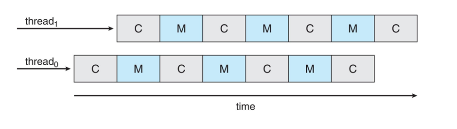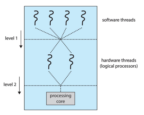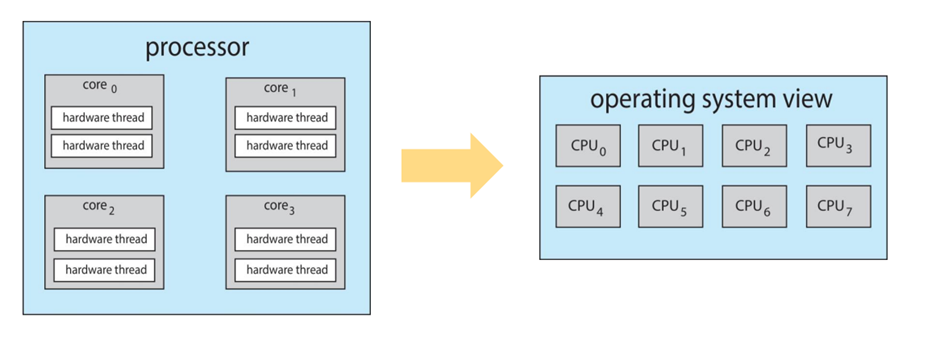 - Chip-multithreading: 예를 들어 하나의 코어가 2개의 hardware thread를 지원할 때 네 개의 코어를 가진 시스템이 있으면 8개의 논리적 cpu를 가진 것으로 간주