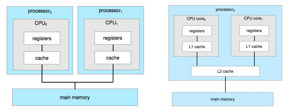 - 멀티 프로세서는 cpu 칩이 여러 개 달려있는 컴퓨터 시스템, 멀티 코어는 싱글 프로세서 안에 스레드를 처리할 수 있는 코어가 여러 개 있는 컴퓨터 시스템