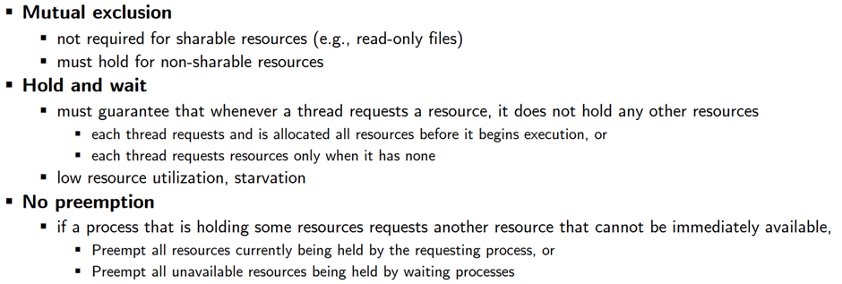 - Deadlock prevention은 request를 제한하는 것이기 때문에 성능이 떨어질 수 있음
