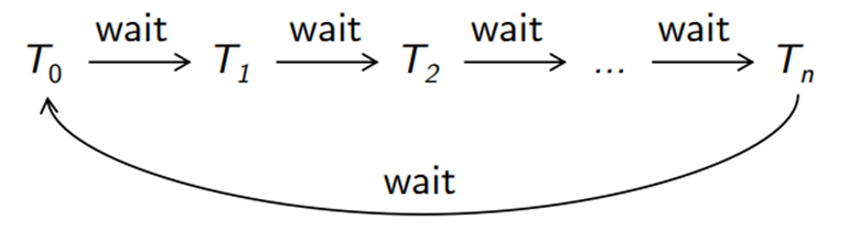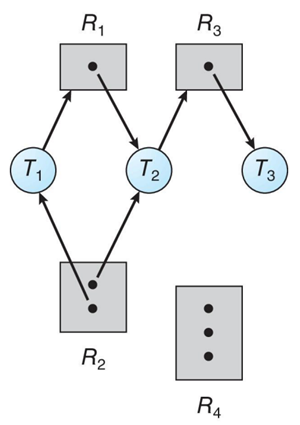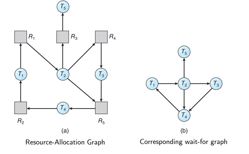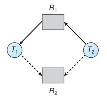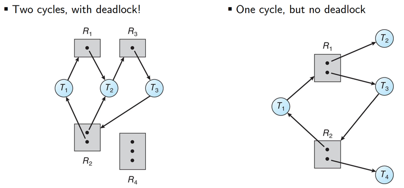 - 사이클이 있으면 데드락 가능성 있음(리소스에 인스턴스가 한 개씩이면 무조건 데드락이지만 여러 개 있으면 아닐 수도 있음)