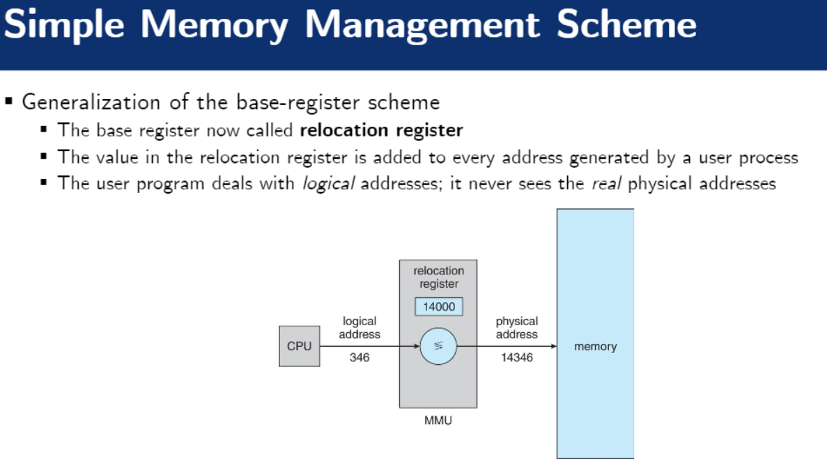 base값을 가지고 있는 레지스터인 base register를 relocation register라 부른다. logical address와 physical address가 연속적이라면 logical address에서 relocation register을 더해주어 physical address를 얻는다.