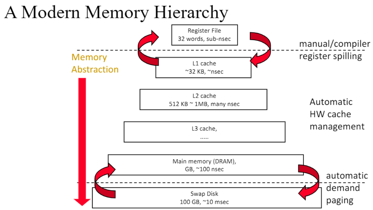 프로그래머는 virtual memory만을 보고 있어서 메모리 공간이 거의 무한하다고 느끼지만 실제 사용할 수 있는 physical memory 공간은 프로그래머가 추정하는 것보다 훨씬 작다. 시스템(system softeware + hardware)은 virtual memory와 physical memory를 서로 mapping 해준다. 이때 시스템이 physical memory를 잘 관리해준다면 프로그래머 입장에서는 메모리 공간이 엄청 거대하다고 느끼는 것이다.