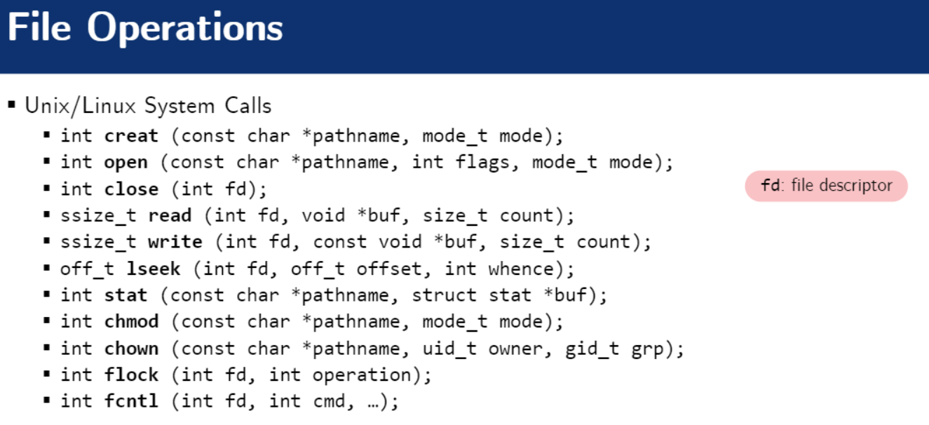 위 그림은 Unix/Linux에서 사용하는 system call들이다. Creat과 Open은 'fd'라는 integer을 리턴하는데 이는 프로세서에서 연 파일들을 구별해주는 역할을 한다.