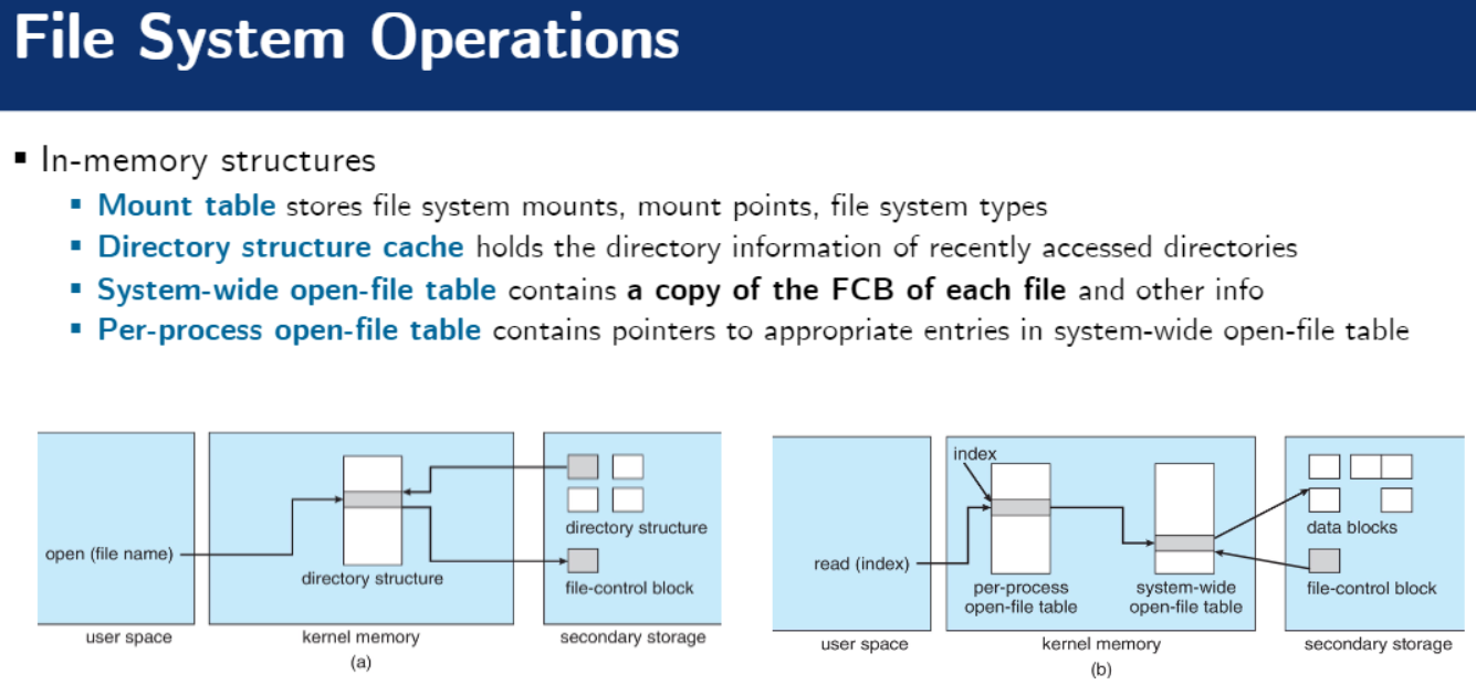 - File Control Block(FCB)는 파일에 대한 정보를 가지고 있다.