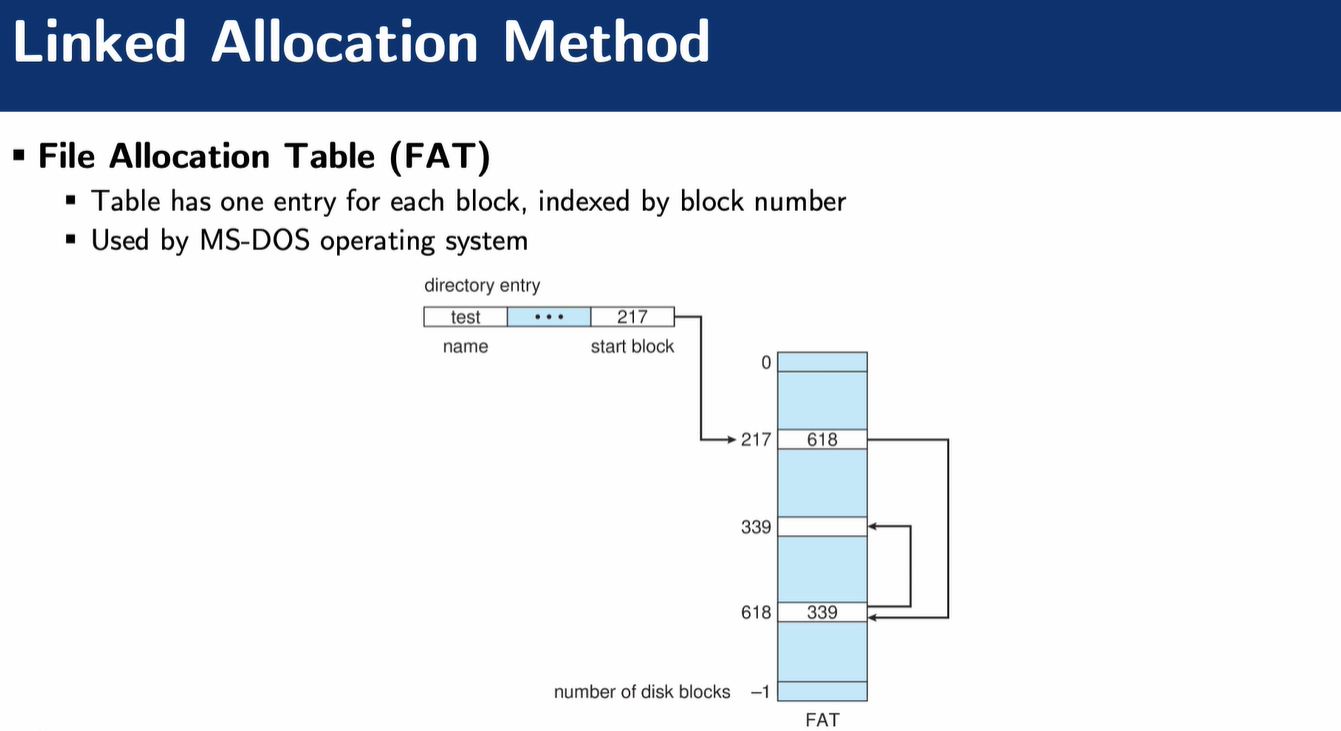 -> 이러한 문제를 해결하기 위해 file allocation table(FAT)를 사용해 접근 시간을 줄일 수 있다.