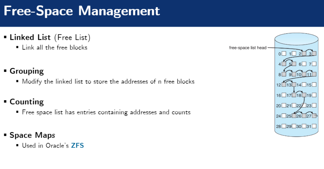 file에 block을 할당하기 위해서는 어떤 block이 비어있는지 알아야한다. file system은 free-space list를 갖고 있으면서 어떤 block이 사용가능한지 파악하고 있어야한다.