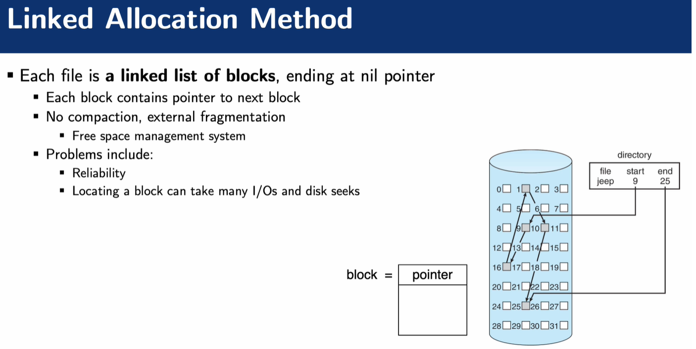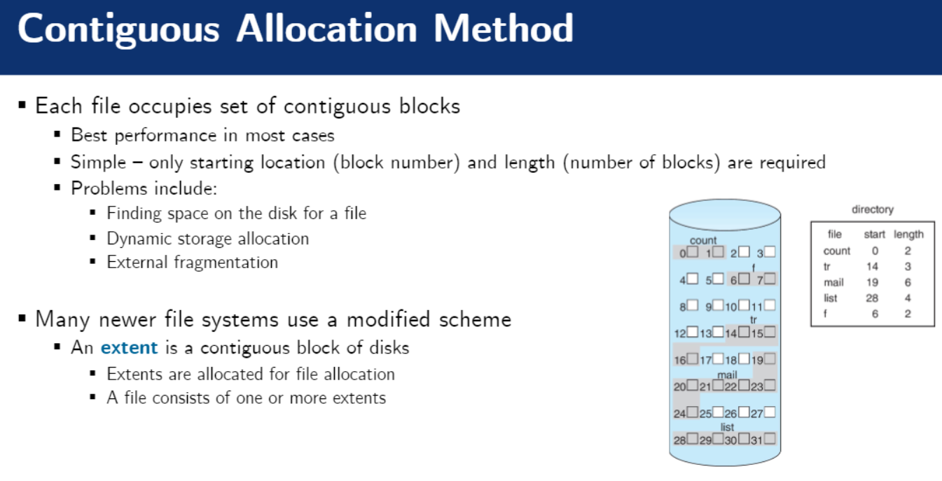 - 파일의 첫 block 위치(starting location)와 몇 개의 block이 할당되었는지(number of block)만 알면 file을 관리할 수 있다.