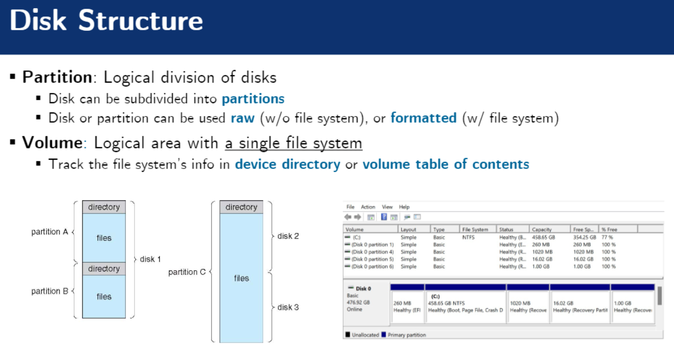 disk나 partition은 file system이 없는 ‘raw’ 상태로 사용될 수도 있고 file system이 ‘formatted’된 상태로 사용될 수 있다.