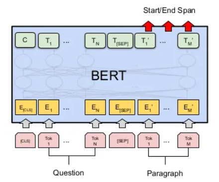 [SEP] 토큰으로 질문과 본문을 구분하며, 본문 속 정답의 시작 인덱스와 마지막 인덱스를 출력하도록 학습된다.