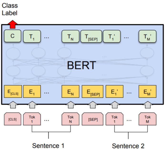두 문장이 주어졌을 때 한 문장이 다른 문장과 논리적으로 어떠한 관계에 있는지를 분류하는 task이다. 이는 문장 쌍을 입력받는 대표적인 task 중 하나로, 자연어 추론(NLI)이 이에 포함된다. 우선 입력되는 문장을 [SEP] 토큰으로 구분하고 [CLS] 토큰이 두 문장의 관계를 나타내도록 학습시킨다.