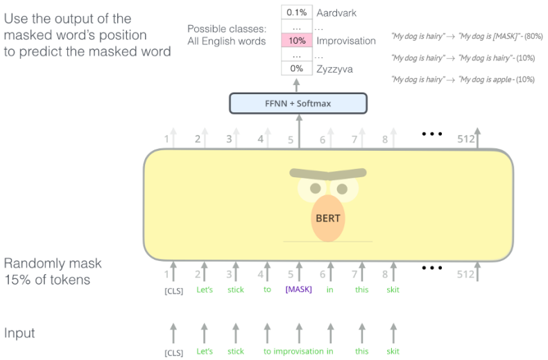 10%는 random word로 ("The cat is on the table" -> "The cat is on the roof")