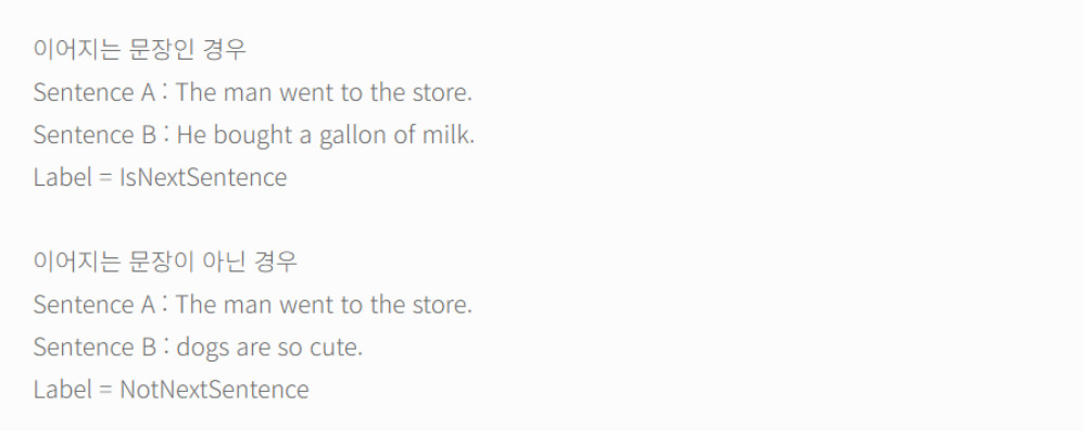 기존의 모델들에서는 Pre-training 단계에서 문장 사이 관계를 파악하는 능력을 따로 학습하지 않았기 때문에 그 부분에 대한 성능이 상당히 떨어졌다. 때문에 BERT에서는 NSP를 통해 두 개의 문장이 이어지는 문장인지 아닌지를 판단할 수 있도록 모델을 훈련하였다.