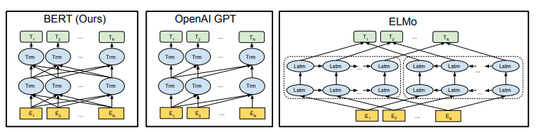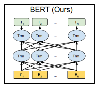ELMo 또한 양방향 모델이긴 하지만 아래 그림과 같이 left to right 모델과 right to left 모델을 단순히 합쳐 만든 것이기 때문에 진정한 양방향 모델이라 하기에는 어려움이 있다고 말하고 있다.