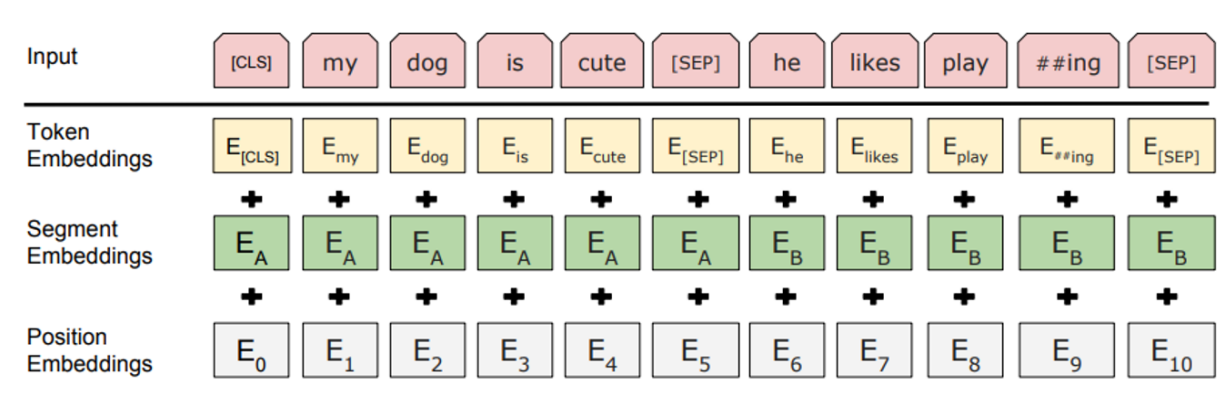 BERT는 입력 문장에 대해 세 가지 임베딩 층을 사용하는데, Token Embeddings, Segment Embedding, Position Embedding이 바로 그것이다.