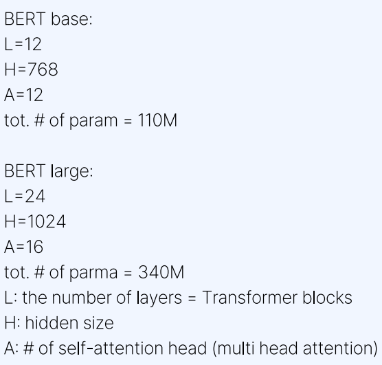 위 그림은 BERT base 모델과 BERT large 모델을 비교하고 있다. 여기서 L은 인코더의 수를, H는 인코더에서 사용되는 뉴런의 개수인 hidden size를, A는 multi head attention의 head 수를 뜻한다.