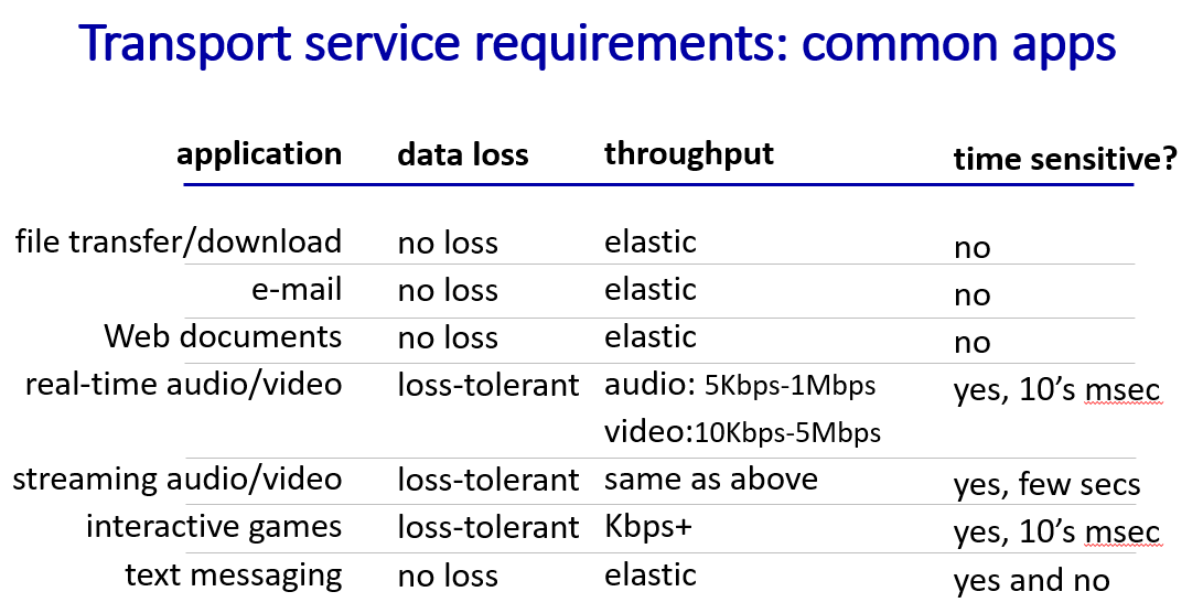 - 데이터 무결성(data integrity): 일부 애플리케이션들(예: 파일 전송, 웹 트랜잭 션)은 100% 신뢰할 수 있는 데이터 전송을 필요로 하는 반면, 오디오와 같은 다른 애플리케이션들은 일부 손실을 용인할 수 있다.