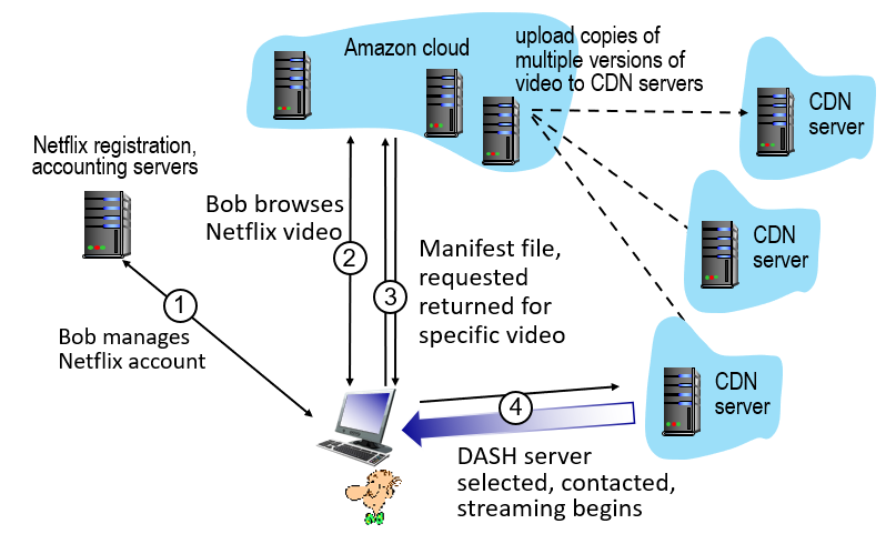 - 어댑티브 스트리밍: 클라이언트는 현재의 네트워크 조건에 따라 적절한 비율로 비디오를 요청한다. 예를 들어, 네크워크 상태가 좋다면 높은 해상도의 비디오를 요청하고, 상태가 나쁘다면 낮은 해상도의 비디오를 요청한다.