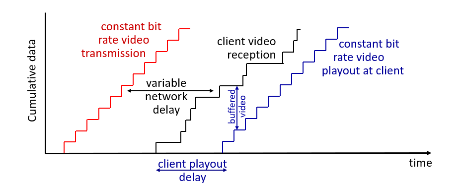 - 변동하는 서버-클라이언트 대역폭: 네트워크의 혼잡도에 따라 시간이 지남에 따라 서버와 클라이언트 사이의 대역폭이 변동할 수 있다. 이는 사용자의 집, 접속 네트워크, 네트워크 핵심 부분, 비디오 서버에서 모두 발생할 수 있다.