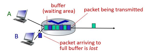 - 버퍼 오버플로우: 각 링크 앞에는 버퍼(또는 큐)가 있어 들어오는 패킷을 임시로 저장한다. 이 버퍼의 용량이 유한하기 때문에, 만약 버퍼가 가득 찬 상태에서 새로운 패킷이 도착하면, 그 패킷은 드롭(즉, 손실)되게 된다.