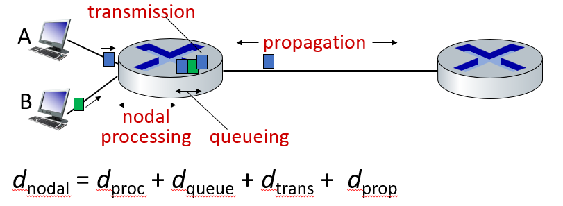 - 노드 처리 지연(dproc): 이는 패킷이 라우터나 스위치 등의 네트워크 노드를 통과하는데 필요한 시간이다. 비트 오류를 확인하고 출력 링크를 결정하는 등의 처리 작업이 포함된다. 일반적으로 이 시간은 밀리초 이하이다.