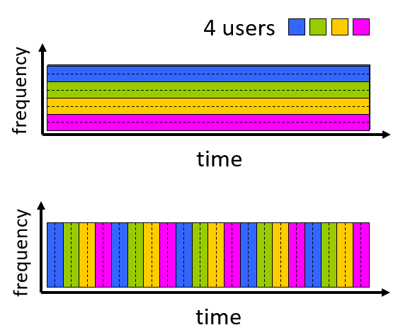 - 시간 분할 다중화(TDM): 이 방식에서는 시간을 슬롯으로 나눈다. 각 통화는 주기적으로 슬롯을 할당받아 전체 주파수 대역의 최대 비율로 전송할 수 있지만, 오직 자신의 시간 동안에만 가능하다. 디지털 네트워크에서 일반적으로 사용되며, 여러 사용자가 같은 통신 채널을 공유하면서도 서로 간섭하지 않게 한다.